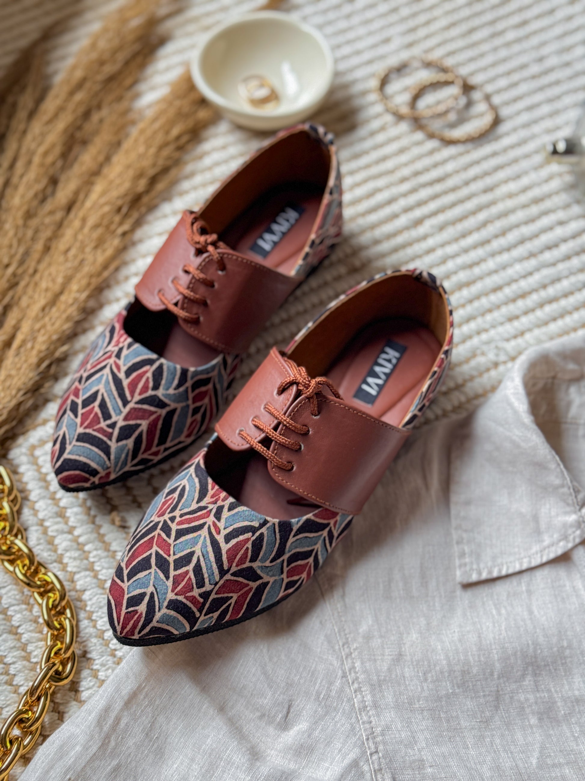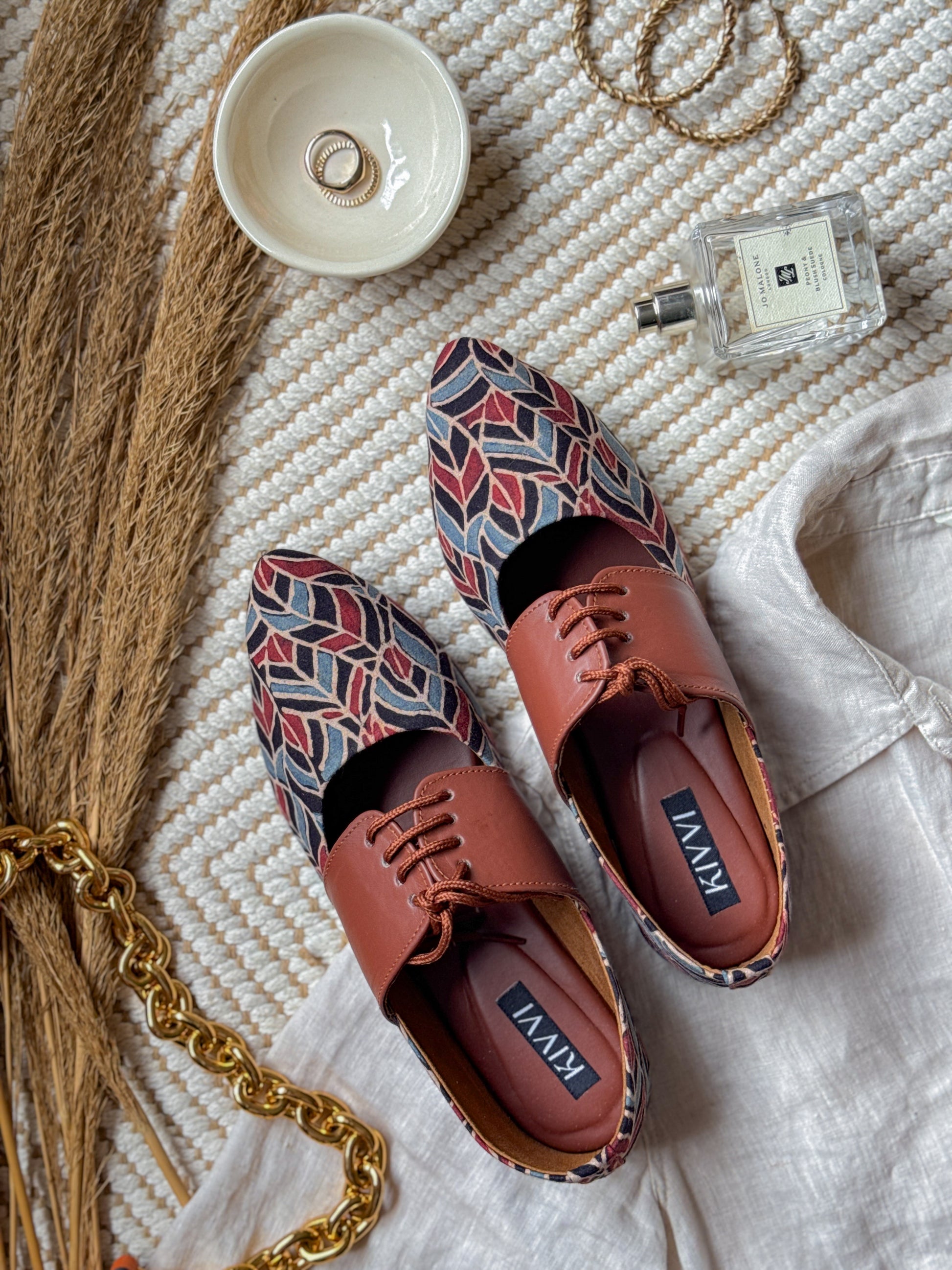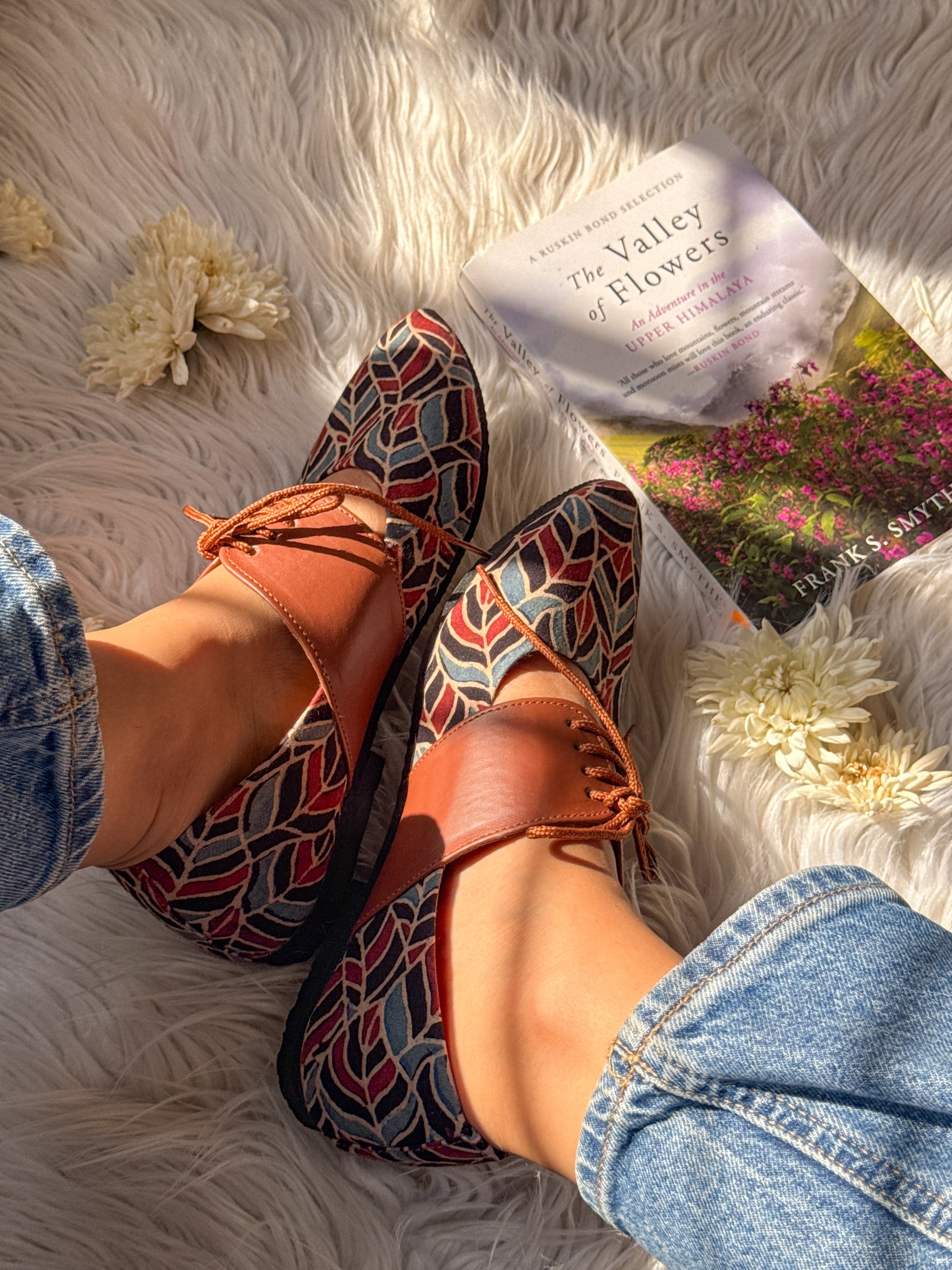Step into the charm of tradition with Ajrak Aura, a graceful blend of heritage and modern comfort. Crafted using authentic Ajrak block-printed fabric and detailed with a sleek rust-toned panel, this pair brings earthy elegance to your everyday. Lightweight, cushioned, and consciously made, Ajrak Aura is a timeless companion for those who walk with rooted style.